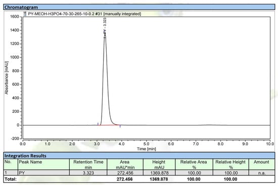 Purity confirmation of α-amylase inhibitors using HPLC: The compound was dissolved in methanol, and then filtered through a 0.22 µm membrane. The sample solution (2 µL) was injected into the HPLC system (Thermo-Ultimate 3000 UPLC system–ThermoScientific, Waltham, MA, USA) and separated by a column (Hypersil GOLD aQ C18 column, 150 mm × 2.1 mm, particle size: 3 µm) using the solvent systems of methanol/acidified 0.1% H3PO4 (70/30 v/v) with the flow rate of 0.2 mL/min. The UV detection wavelength was 265 nm.