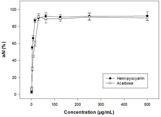 In microbial technology, reactor systems are considered strong tools for scaling-up the bioproduction of active secondary metabolites and significantly reducing cultivation time [2,49,50]. In this work, we utilized a 14 L-bioreactor system for fermentation to scale up the production of aAIs. As shown in Figure 3, aAIs were produced after 4 h of fermentation and reached the highest productivity, i.e., 4200 U/mL, at 12 h. These experimental data indicated that the scale-up in a bioreactor system yields significantly higher aAI productivity in a much shorter fermentation time than that in a flask. Previously, several studies reported the production of antidiabetic compounds via microbial fermentation [26,27,28,29,30,31]. However, in most of these works, compounds were produced on small scales in flasks. In this work, we attempted the large-scale production of antidiabetic compounds in a 14 L-bioreactor system and achieved positive outcomes.