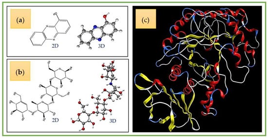 The 2-D and 3-D structures of hemi-pyocyanin (a) and acarbose (b), and the crystal structure of α-amylase (c).