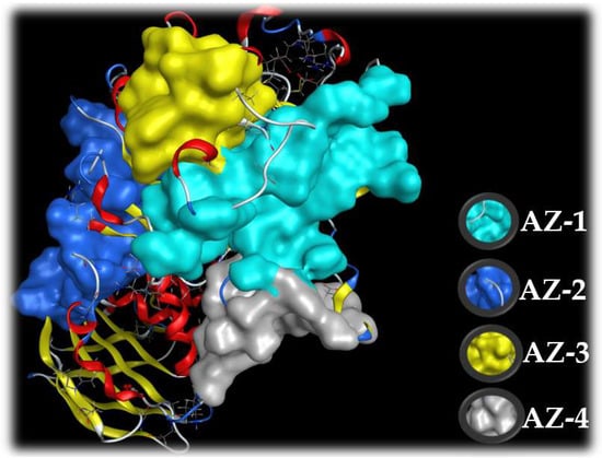 The four active zones (AZ) on the target enzyme, α-amylase, based on MOE output data using the site finder function.
