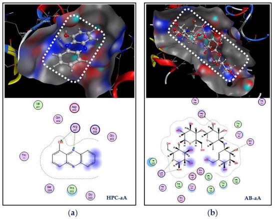 Docking study of hemi-pyocyanin (HPC) and acarbose with the α-amylase enzyme. The interactions and binding of the ligands HPC and acarbose with the α-amylase enzyme are labeled as HPC–aA (a) and AB–aA (b), respectively.