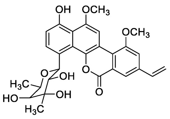 - Kharel, M.K.; Nybo, S.E.; Shepherd, M.D.; Rohr, J. Cloning and Characterization of the Ravidomycin and Chrysomycin Biosynthetic Gene Clusters. ChemBioChem 2010, 11, 523–532. [Google Scholar] [CrossRef] [PubMed]