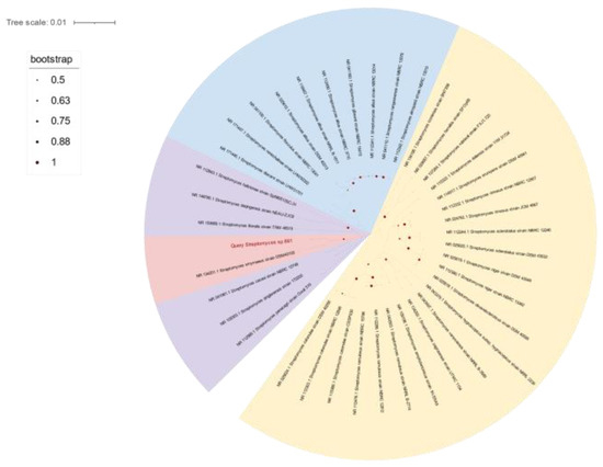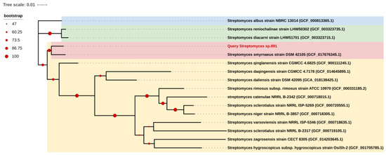 The opaque colonies of strain 891 were spherical and wrinkled, and its curly or spiral mycelia cultivated for 14 days were differentiated into spore chains (Figure 2), suggesting this isolate had the common morphological characteristics of Streptomyces. BLAST analysis of the 16S rRNA gene sequence displayed that strain 891 had the highest similarity (98.93%) with the strain Streptomyces smyrnaeus DSM 42105. By hybridizing next-step generation (Illumina) and third-generation (PacBio) sequencing technologies, a high-quality chromosome-level genome of strain 891 together with a plasmid was assembled, and its sequence was deposited into GenBank and linked to BioProject PRJNA615006. Further, based on the 16S rRNA gene and whole genome sequences phylogenetic analysis, this strain made a monophyletic group with S. smyrnaeus DSM 42105, deposited in the NCBI database (Figure 3 and Figure 4) [18]. The average nucleotide identity (ANI) value for strains 891 and DSM 42105 was determined as 87.04%, indicating these strains belonged to species that were significantly different [19]. Accordingly, strain 891 was undoubtedly classified into the genus Streptomyces.
