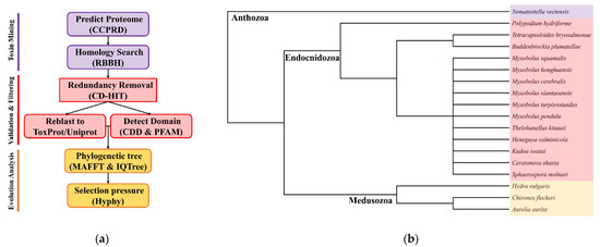 (a) The customized bioinformatics pipeline used in this study identified and filtered toxin-like proteins from the sequenced datasets and available omics data; (b) cladogram of species used in this study including 14 Endocnidozoa taxa. Adapted from Klompen et al. (2021) and Hartigan et al. (2021) [6,25].