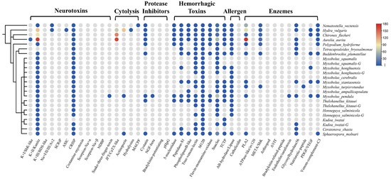 The presence and absence of venom protein families in myxozoans and some cnidarians. A schematic tree of the species used in this project is shown on the left. The circles indicate the presence of a toxin family in that species, and the different colors represent the number of that family. The color gradient on the right corresponds to the numbers. Gray means absent.