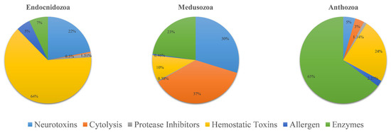 The venom composition is shown in Figure 3. Overall, the pattern of TLPs in Endocnidozoa was similar. Hemorrhagic toxins were the most diverse family of toxins; they accounted for more than 63% of TLPs. The next most common were neurotoxins (21.9%). Enzymes, allergens, protease inhibitors, and cytolysins were also found in the endocnidozoans, but they accounted for only a small fraction of TLPs. In N. vectensis, we found that the most diverse toxin family was enzymes, which constituted more than 64.7% of TLPs. For medusozoans, cytolysins were found to be the most diverse toxin family (36.8%).