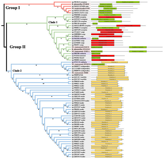PLA2 has been found in anthozoans, scyphozoans, hydrozoans, and cubozoans [39,40]. The toxic functions of PLA2 in cnidarian venoms include defense, prey digestion, and hemolytic activity [41,42]. The tree was divided into Group I and Group II (Figure 5). Two myxozoan sequences, three cone snail sequences, and one scorpion sequence formed Group I. Group II contained two main clades. Clade 1 included many venomous taxa, such as scorpions and wasps. The three myxozoan sequences were classed into Clade 1. Clade 2 mainly included snakes. There were only two myxozoan sequences in Clade 2: S. molnari clustered with scolopendras, and M. pendula clustered with a Blenniidae fish Meiacanthus atrodorsalis.