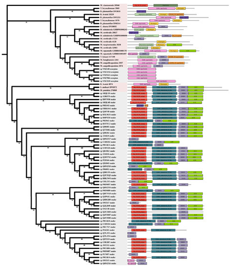 We used TBtools v1.098669 [94] to extract the domain of toxin protein sequences for conducting phylogenetic trees. Other sequences were obtained from VenomZone (https://venomzone.expasy.org, accessed on 10 May 2020). Retrieved amino acid sequences were aligned with MAFFT v7.205 [95] by the L-INS-i method. Multiple alignments were trimmed using Gblocks v0.91b [96]. Phylogenetic trees were constructed using a maximum likelihood (ML) approach by IQ-TREE v2.1.1 [97] and node support was obtained with 1000 ultrafast bootstrap. Searches with multiple 500 initial parsimony trees were performed. Bootstrap support values were assigned on the best maximum likelihood tree branches. The tree was collapsed and formatted using iTOL v4 [98].