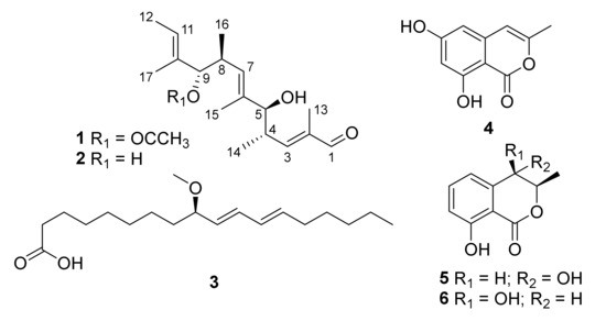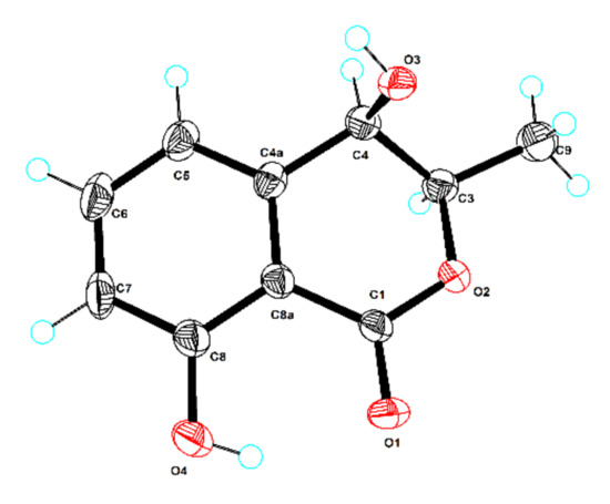 The known compounds were elucidated as 5,9-dihydroxy-2,4,6,8,10-pentamethyldodeca-2,6,10-trienal (2) [16], (+)-(9R,10E,12E)-9-methoxyoctadecadienoic acid (3) [20], saccharonol A (4) [21], (3R, 4S)-(−)-4-hydroxymellein (5) [22], and (3R, 4R)-(−)-4-hydroxymellein (6) [23], respectively, by comparing their physicochemical properties and spectroscopic data with the reported literature values. Notably, the X-ray crystal structure of 6 (CDCC 2132859, Figure 3) with a flack parameter of 0.02(6) is described herein for the first time. Linear polyketides with diverse structures are assembled by the polyketide synthase pathway. However, the minor compound 1 was likely derived from the major amount of compound 2 by a trans-esterification transformation during the preparation of the crude fungal extract and in the complex isolation process.