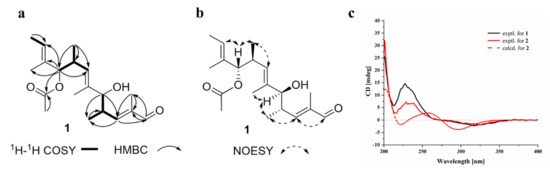 The configurations of the Δ2, 6, 10 double bonds were all deduced as E, based on the NOESY correlations of H1-1/H1-3, H1-5/H1-7, and H1-9/H1-11 (Figure 2b). The relative configurations of C-4/C-5 and C-8/C-9 were analyzed by proton–proton spin-coupling constant analysis. The large coupling constants, 3JH4-H5 (7.0 Hz) and 3JH8-H9 (8.5 Hz), indicated the threo configurations of C-4/C-5 and C-8/C-9 [17,18]. Furthermore, the absolute configuration of the linear polyketide (1) was alternatively determined by comparison of the experimental ECD curves with that of compound 2 (Figure 2c). From a biosynthetic point of view, they shared the well-matched experimental ECD curves (positive Cotton effects at 200 and 225 nm, and negative Cotton effect at 325 nm). According to the configuration of the closest structure of 2, TMC-151s (Supplementary Materials, Figure S10), which was unambiguously determined by X-ray single crystal diffraction analysis [19], the ECD calculation of (2E, 4S, 5S, 6E, 8S, 9S, 10E)-2 was further subjected to verify the absolute configuration as shown in Figure 2c. The well-matched experimental and calculational ECD curves revealed the (2E, 4S, 5S, 6E, 8S, 9S, 10E)-configuration of 2. Finally, the absolute configuration of 1 was determined as (2E, 4S, 5S, 6E, 8S, 9S, 10E)-1.