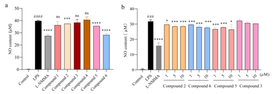 Inhibition of nitric oxide production by compounds 2, 5, and 6. (a) Cells were exposed to 0.1 μg/mL LPS and co-treated with compounds 1–6 (10 μM) for 24 h, respectively. NO production in the supernatant was detected after 24 h of LPS-induction, n = 5. (b) Cells were exposed to 0.1 μg/mL LPS and separately co-treated with compounds 2, 3, 5, and 6 (1, 5, and 10 μM). NO production in the supernatant was detected after 24 h, n = 5. All data are presented as the mean ± SD of three independent experiments. ns, p > 0.05, * p < 0.05, *** p < 0.005, **** p < 0.001 vs. LPS group; ### p < 0.005, #### p < 0.001 vs. control group, n = 3. p value was assessed by two-tailed Student’s t-test.