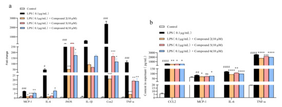 Anti-inflammation activity of compounds 2, 5, and 6. Cells were exposed to 0.1 μg /mL LPS and co-treated with 2, 5, and 6 (1, 5, 10 μM) for 24 h, respectively. (a) qPCR analysis of pro- inflammatory cytokines genes (MCP-1, IL-6, iNOS, IL-1β, Cox2, and TNF-α) normalized by β-actin, n = 3. (b) Compounds 2, 5, and 6 reduced the release of LPS-induced IL-6, CCL-2, TNF-α, and MCP-1 in culture medium, n = 3. All data are presented as the mean ± SD of three independent experiments. ns, p > 0.05, * p < 0.05, ** p < 0.01, *** p < 0.005, **** p < 0.001 vs. LPS group; # p < 0.05, ## p < 0.01, ### p < 0.005, #### p < 0.001 vs. control group, n = 3. p-Value was assessed by two-tailed Student’s t-test.