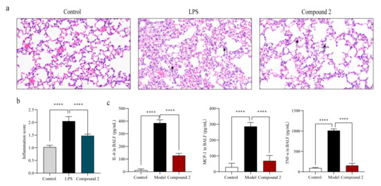 All animal experiments have been approved by the Medical Ethics Committee of Peking Union Medical College (approval code: SLXD—20211123056, date: 13 December 2021) and comply with the regulations of the National Institutes of Health regarding the care and use of animals in research. Briefly, 6-week-old male BALB/c mice were purchased from Vital River Laboratories Co., Ltd. (Beijing, China). The animals were randomly divided into 3 groups (n = 6): the control group, the model group, and the compound 2 group. Mice in the compound 2 group were orally administrated with compound 2 (35 mg/kg) for 24 h before LPS (5 mg/kg) treatment, with saline used as the control in the other two groups. After 6 h of LPS administration, the animals were sacrificed for the collection of bronchoalveolar lavage fluid (BALF) and lung tissues. The content of inflammatory cytokines in BALF was determined by ELISA, and the upper left lungs from each group (n = 6 per group) were fixated with 4% buffered formalin solution. Serial sections 3 μm thick were stained with hematoxylin and eosin (H&E).