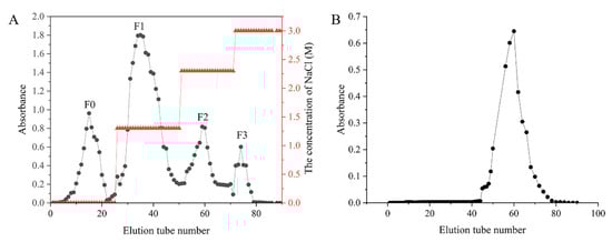 F was purified by DEAE cellulose 52 column (2.6 × 80 cm), followed by step elution with different concentrations of NaCl. The content of polysaccharides in the eluent was tracked and detected by phenol–sulfuric acid method [39] until complete elution. The polysaccharides were obtained after 48 h desalination, rotary evaporation concentration and vacuum freeze-drying. The polysaccharides obtained from 0, 1.3, 2.3 and 3.0 M NaCl eluents were called F0, F1, F2 and F3, respectively.