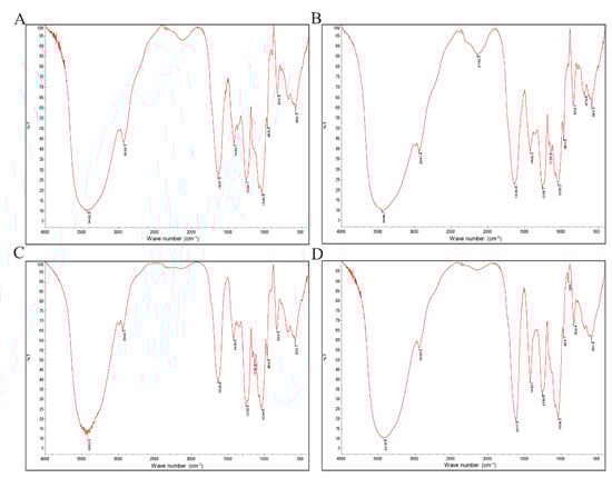 The FTIR spectrum of the four fucoidans was basically the same. As shown in Figure 3, there was a broad absorption peak caused by the stretching vibration of intramolecular or intermolecular hydrogen bonds of polysaccharides at 3418–3500 cm−1. The results showed that the extracted fucoidan had C-H stretching vibration at 2928–2942 cm−1 and carbohydrate C-H deformation vibration from 1420–1425 cm−1. There was an amide group C=O stretching vibration peak at 1617–1637 cm−1. There was a stretching vibration peak of S=O at 1255 cm−1, indicating that it contained sulfate radicals. The absorption peak was caused by the stretching vibration of C-O-C, by the angular vibration of C-O on the sugar ring C-O-C at 1050 cm−1, and by the characteristic absorption peak of β-glycosidic bond at about 897 cm−1.
