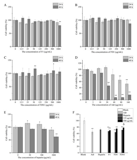 The HUVEC cells were inoculated in 96-well plates and exposed to F1, FD1 and FDS1 for 24 and 48 h, respectively. Fucoidans were dissolved in DMEM medium. The exposure concentration of fucoidans was 0,12.5, 25, 50, 125, 250, 500, 1000 μg/mL. In addition, cell viability was measured after the cells were treated with 0, 5, 10, 20, 40, 80, 160 μg/mL Adr for 24 h. The cells were cultured in 20 μL 5 mg/mL MTT solution for 4 h. After 4 h, the supernatant was discarded, and 150 μL DMSO was added to avoid light for 10 min. The absorbance was measured at 570 nm by using enzyme-labeling instrument (BioTek, Winooski, VT, USA). According to the method of Pozharitskaya et al. [47], heparin was used as the positive control. The cells were inoculated 24 h after 96-well plate, and 50, 500, 5000 μg/mL heparin was added. MTT assay was used to detect the effect of different concentrations of heparin on HUVEC viability.