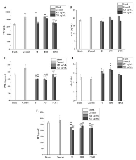F1, FD1 and FDS1 affects the levels of cytokines secreted by Adr-induced HUVEC: (A) vWF, (B) t-PA, (C) PAI-1, (D) t-PA/PAI-1, (E) TF. Compared with the concentration of fucoidan 0 or Blank, the significance is expressed by * p < 0.05 and ** p < 0.01. Compared with the Adr group, the significant difference is expressed by # p < 0.05 and ## p < 0.01. Blank means that HUVEC only exposes DMEM medium. Control refers to the negative control.