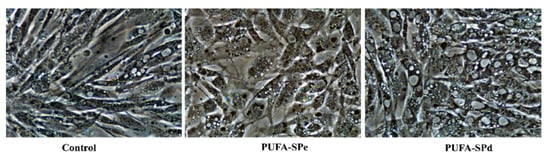In our study on the Sparus aurata cell line, changes in response to the treatments were observed, starting from cellular morphology. Figure 1 shows that cells treated with PUFA-SPe showed lower lipid accumulation than those exposed to PUFA-SPd. PUFA-SPd treated cells were more rounded with an enlarged cytoplasm, losing the fibroblastic shape and a significant lipid accumulation, suggesting that PUFA-SPd might stimulate fat uptake and fat cytoplasm accumulation. These findings are in agreement with the anti-adipogenic effects of PUFA during pre-adipocyte differentiation in cobia (Rachycentron canadum) [], Atlantic salmon (Salmo salar) [], and rainbow trout (Oncorhynchus mykiss) [].