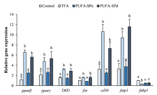 Peroxisome proliferator-activated receptors (PPAR) are nuclear receptor proteins that function as fatty acid-activated transcription factors with a key regulatory role in lipid metabolism []. pparβ and pparγ are target genes involved in adipocyte differentiation and in lipid storage [,]. In our study, pparβ and pparγ genes were significantly upregulated (p < 0.05) in SAF-1 cells treated with TFA and PUFA-SPd, compared to no-treated cells (control) (Figure 2). pparβ and pparγ mRNA levels in cells treated with PUFA-SPe were similar to the control (Figure 2). Li et al. [] reported that dietary fish oil decreased pparγ gene expression in intraperitoneal fat of Ctenopharyngodon idellus, suggesting that ω-3 PUFA could inhibit lipid accumulation by affecting the expression of lipid-metabolism-related genes.