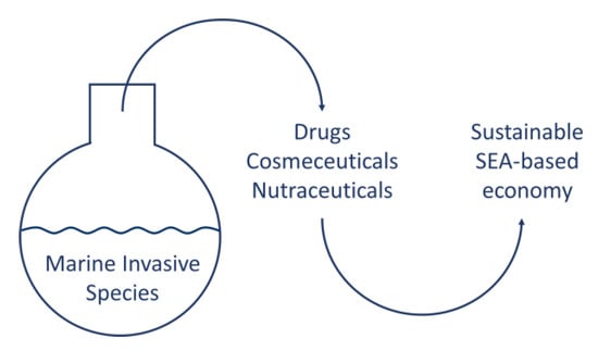 Although those mentioned are just a few examples from a growing literature, they give an idea of how much work remains to be done in the identification of the bioactive ingredients that can be obtained from MIS. This Special Issue of Marine Drugs entitled “Marine Invasive Species and Their Bioactive Metabolites” aims to fill some of these gaps, giving priority for publication to submissions that might promote eco-innovation by helping to turn relevant ecological threats into opportunities for sustainable development of the sea-based economy (Figure 1).
