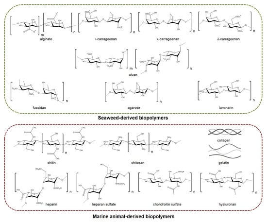 The marine ecosystem, due to its high biodiversity, represents a plentiful source of bioactive compounds with diverse structures and biological properties [1,2]. Among them, biopolymers, including polysaccharides and proteins, are abundantly found in all marine organisms, serving biological and structural functions. They are often isolated from a variety of marine organisms, including algae, crustaceans, fish, shellfish, mollusks, and microorganisms, and have been extensively investigated for their potential applications in various sectors [1,2,3]. In recent years, there has been an increasing interest in the biomedical sector for marine biopolymers due to their diversified chemical structures and functionalities which, in turn, attenuate their biological and physicochemical properties [4,5,6,7]. Characterized by low immunogenicity, remarkable bioavailability, chelating ability, and stability, marine-derived polymers often represent materials of choice for biomedical applications. The broad spectrum of their bioactivities—such as anticoagulant, antioxidant, antimicrobial, anticancer, and cell proliferative effects—and their excellent biocompatibility and biodegradability make them ideal candidates as safe biomaterials for the development of value-added biomedical systems for tissue regeneration, drug delivery, and wound healing applications [2,3,8].