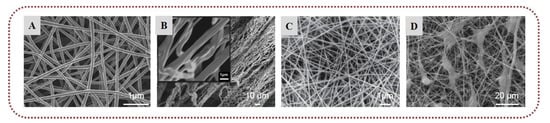 Ulvan-based nanofibers: SEM images of (A) ulvan/PVA (1:1). Reprinted/adapted with permission from [102], Copyright 2011, Elsevier; (B) ulvan/PCL (3:8). Reprinted/adapted with permission from [103], Copyright 2015, John Wiley and Sons; (C) ulvan/PVA (2:1). Reprinted/adapted with permission from [104], Copyright 2021, Elsevier; (D) fibroblasts adopting a stellate morphology on ulvan cellulose acetate/polydioxanone fibers. Reprinted/adapted with permission from [105], Copyright 2021, Elsevier.