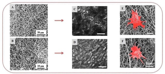 Fucoidan and κ-carrageenan-based nanofibers: SEM images of (A) polydioxanone/κ-carrageenan (70/30) electrospun nanofibers and (B) polydioxanone/fucoidan (70/30) electrospun nanofibers. NIH3T3 cells seeded on (C) polydioxanone/κ-carrageenan and (D) polydioxanone/fucoidan nanofibers after 7 days. SaOS-2 cells seeded on (E) polydioxanone/κ-carrageenan and (F) polydioxanone/fucoidan nanofibers in osteogenic differentiation medium. Reprinted/adapted with permission from [116], Copyright 2017, American Chemical Society.