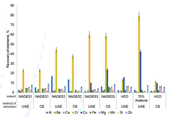 NADES (Table 1) were tested under constant extraction conditions (solvent ratio of 1:10, an extraction time of 60 min, an extraction temperature of 60 °C), and a stirring speed of 700 rpm in the case of conventional extraction (CE). Significant differences in the co-extraction of trace metals with the tested NADES were reflected by the profiles (Table 2) and the calculated recovery of elements (Figure 1). It is interesting to note that all of the used NADES did not recover As and Co (concentration < LOQ, Table 1); the low recovery of elements, such as Ba, Ca, Fe, Mg, Mn, Sr, and Zn (recovery < 9%), were found in NADES extracts. The recovery of Al and Cr was relatively high and considerably varied (from 1.5 to 59.9%).