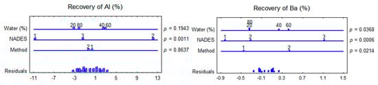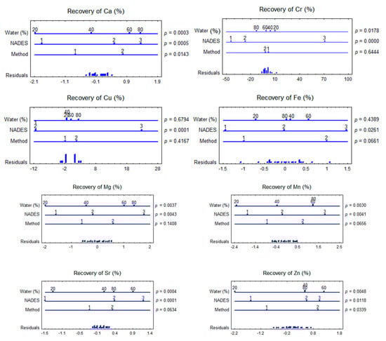 The impact of NADES composition, water content in NADES, and the extraction method on the co-extraction of trace elements from F. vesiculosus were evaluated using multifactorial ANOVA (Figure 2). The multifactorial ANOVA test showed significant differences in the recovery of elements from F. vesiculosus when different NADES with variable water contents and different extraction methods were used. The method of extraction had not shown a statistically significant effect at a confidence level of 95% on the co-extraction of all elements (excluding Ba and Ca). In contrast, the water content in NADES was significantly affected on the recovery of Ba, Ca, Mg, Mn, Sr, and Zn. NADES1 provided the lowest contents of all elements, and the highest extracted amounts were obtained employing water contents of 60–80%.