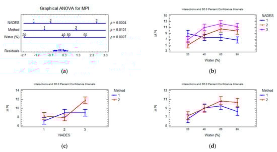 Multifactorial ANOVA plots. Influence of extraction parameters and composition of NADES on the metal pollution index. (a) Factors evaluated and p-values obtained; (b); interaction plot of content water in NADES and composition of NADES; (c) interaction plot of composition of NADES and extraction method; (d) interaction plot of extraction method and content water in NADES. Multifactorial ANOVA plots showing the influence. p-values lower than 0.05 indicated a statistically significant effect at a confidence level of 95%. Method: UAE (1), SE (2); NADES:NADES1 (1), NADES2 (2), NADES3 (3) (q.v. Table 1).