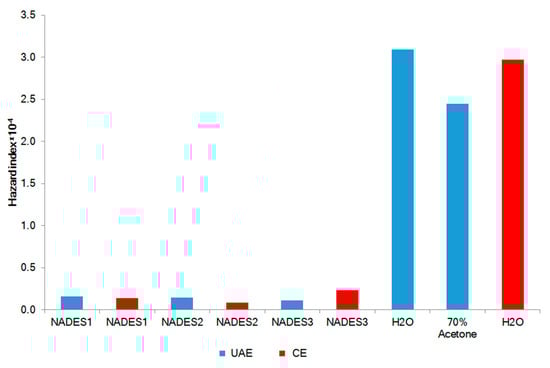The hazard quotient (HQ) is used for the health risks assessment of contaminated medicinal products for topical application. HQ is the ratio of a determined dose of pollutant to a reference dose level. The HQ >1 shows likely the negative impact of the product []. The HQ levels of the studied metals Al, Ba, Ca, Cr, Cu, Fe, Mg, Mn, Sr, and Zn were calculated as 2.19 × 10−7, 6.54 × 10−8, 1.15 × 10−7, 4.63 × 10−6, 2.78 × 10−8, 4.09 × 10−8, 4.77 × 10−6, 4.27 × 10−6, 2.79 × 10−7, and 1.49 × 10−7, respectively. The HQ levels for all the metals were considerably less than 1, showing no significant health risk via dermal adsorption of the studied NADES extracts. The combined non-carcinogenic effect of multiple elements is expressed by the hazard index (HI). The mean HI for NADES extracts from F. vesiculosus (HI = 1.46 × 10−5 ± 5.03 × 10−6) as well as from aqueous and 70% acetone extracts (HI= 2.83 × 10−4 ± 3.41 × 10−5) were less than 1 (Figure 4). This shows no carcinogenic risk after topical application.