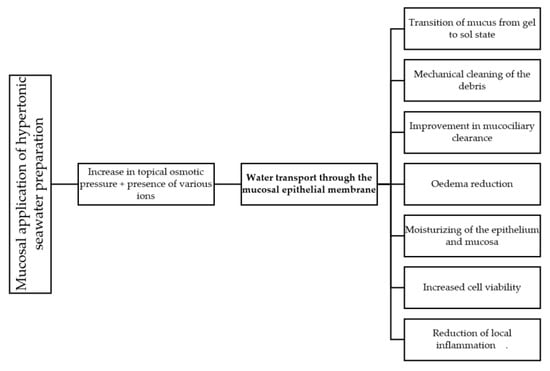 The mechanism displayed in Figure 1 centers on the transport of water through the mucosal epithelial membrane, provoked by the local application of hypertonic solution. The nasal mucosa is hydrated and moisturized by both the local application of solution and the influx of water through the membrane. This leads to increased mucociliary clearance (MCC) [,]. Additionally, liquid transport through the membrane results in the accumulation of liquid in the nasal lumen, which concept was also proven in other organs and tissues, both in vitro [,] and in vivo [,]. Reduction in swelling (oedema) is seen in submucosal tissue, while the immediate effect of excess liquid in the nasal lumen is mechanical cleaning of mucus, crusts and debris. Immediately following this, the state of the mucus changes from gel to sol []. The transition of mucus from gel to sol state greatly reduces the amount of energy needed by cilia to transport such mucus [], significantly improving the efficacy of the mucociliary transport. Additional ionic constituents of seawater show other effects, such as increased cell viability and inflammation reduction (Figure 1 and Table 2).