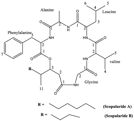 - Yu, Z.; Lang, G.; Kajahn, I.; Schmaljohann, R.; Imhoff, J.F. Scopularides A and B, Cyclodepsipeptides from a Marine Sponge-Derived Fungus, Scopulariopsis brevicaulis. J. Nat. Prod. 2008, 71, 1052–1054. [Google Scholar] [CrossRef]