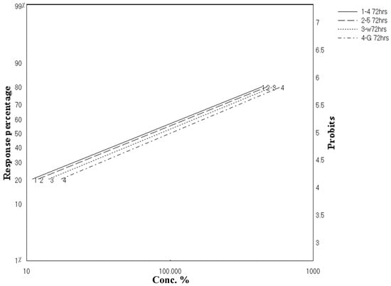 Mortality data were recorded in a probit regression line and we calculated LC50, LC90, slope function, and X2 [59], and correction for control mortality was conducted using Abbott’s formula according to [60]: