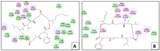 The ligand displayed –(C-docker interaction energy) = −99.54 kcal/mol and hydrogen bonds with Arg 132, Tyr 609, Gly 918, and Gly 964. Figure 5 presents the bindings of both scopularide A and B with protease, respectively. Scopularide A, which showed –(C-docker interaction energy) = −65.46 kcal/mol, displayed three hydrogen bonds with Tyr 748, Gly 916, and Gly 918. Meanwhile, scopularide B had –(C-docker interaction energy) = −62.22 kcal/mol and showed four hydrogen bonds with Arg 131, Tyr 748, Gly 916, and Gly 918.
