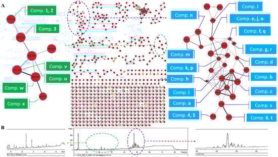 Molecular network of the fungus A. luteoalbus CH-6. (A) A full scan of the secondary metabolites’ profiles molecular network of the fungus A. luteoalbus CH-6 and annotated compounds. (B) HPLC fingerprint of the secondary metabolites of the fungus A. luteoalbus CH-6.