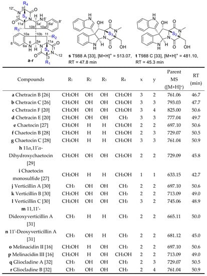 Structures of thiodiketopiperazine derivatives a−t and their retention time in HPLC [16,20,26,27,28,29,30,31,32,33].