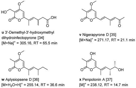 Structures of α-pyrone derivatives u−x and their retention time in HPLC [34,35,36,37].