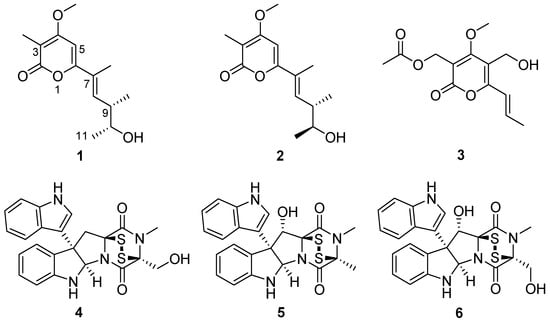The NMR and OR data of compounds 3–6 (Figures S25–S32, Table S2) were exactly the same as those in the literature [19,32,33,42,43], so 3–6 were elucidated to be multiforisin G [42], luteoalbusin A [19,43], gliocladine C [32], and T988 C [33], respectively.