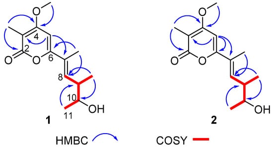 Key COSY and HMBC correlations of compounds 1 and 2.