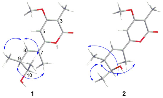 Acrostalapyrone B (2) (Figure 4) was gained as an amorphous powder with the molecular formula of C14H20O4 determined by HR-ESI-MS (Figure S16), which was the same as 1. The 1H and 13C NMR data of 2 were very similar to those of 1 (Table 4) indicating that 2 and 1 shared the same plane structure. The obvious differences between the 13C NMR data (Table 4) of 2 and 1 were the higher field shifts of C-7 (δC 125.7 in 2 vs. δC 126.4 in 1) and C-11 (δC 20.8 in 2 vs. δC 21.3 in 1) which might suggest the different configurations of C-7 and C-10 in 2 and 1.