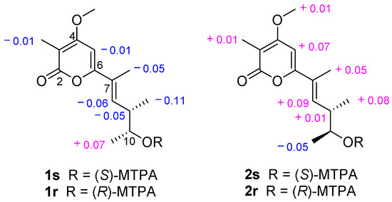 The absolute configurations of 1 were ascertained by modified Mosher’s methods [40,41]. The (S)- and (R)-MTPA esters of 1, 1s, and 1r, were obtained after treatment of 1 with (S)- and (R)-MTPA-Cl, respectively. The 10R configuration of 1 was revealed by the ΔδH(1s–1r) values ΔδH-11 = +0.07, ΔδH-9 = −0.05, ΔδH-9 Me = −0.11, ΔδH-8 = −0.06 (Figure 7), following the Mosher’s rules. Therefore, the absolute configurations of 1 were confirmed to be 7E,9S,10R. The α-pyrone analogs were named by the name of the isolated fungi and the structural type of the compounds [38,39], compound 1 was named acrostalapyrone A.