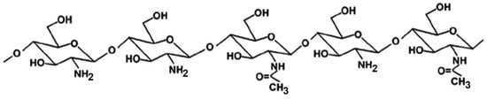 CS is a linear polysaccharide of natural origin, obtained by full or partial deacetylation of chitin, the second most abundant biopolymer in nature after cellulose, being the primary component of the exoskeleton of marine organisms (such as crabs, lobsters and shrimps), which represent its main commercial sources [13,14] CS is a copolymer composed of randomly distributed β-1,4-linked D-glucosamine and N-acetyl-D-glucosamine units (Figure 1).