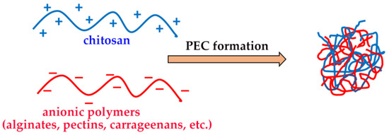 The ability of CS to form hydrogels, by physical or chemical crosslinking, is well known, and it was widely exploited for the development of a variety of drug delivery devices able to provide a local and sustained drug release [38,64]. Chemical hydrogels were obtained, for example, by CS crosslinking via covalent bonds with other polymers, such as hyaluronic acid [65], polyvinyl alcohol [66] or by UV irradiation [67]. On the other hand, physical “reversible” hydrogels can be obtained by the formation of polyelectrolyte complexes (PECs) based on the spontaneous establishing of electrostatic interactions between the protonated ammonium groups of CS and a variety of oppositely charged polymers, particularly from a natural origin, such as gums, alginates, pectins, carrageenans, etc. (Figure 4) [46].