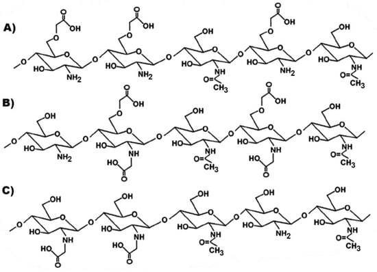 Representative structures of different types of carboxymethylated chitosan (CS): (A) O-carboxymethyl-CS; (B) N, O-carboxymethyl-CS; (C) N-carboxymethyl-CS.