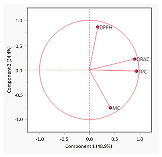PCA loading plot of total phenolic content (TPC), oxygen radical scavenging capacity (ORAC), DPPH radical scavenging activity (DPPH), and metal chelating (MC) measurements.