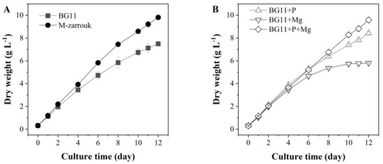 (A) Effects of the culture media BG11 and M-Zarrouk on biomass production of T. aequale, and (B) growth of T. aequale as affected by spiking the additional amount of phosphate (0.60 g L−1) or magnesium (0.13 g L−1) or both in the BG11. Experiments were conducted in glass columns (4.3 cm inner diameter) that each contained 900 mL culture medium. Culture temperature was 25 °C, and cool white fluorescence light was provided continuously at a light intensity of 200 μmol m−2 s−1. Culture pH was maintained at pH of 7.5–8.0 by providing compressed air bubbles containing 1~2% CO2. Values are expressed as mean ± standard deviation of three replicates.