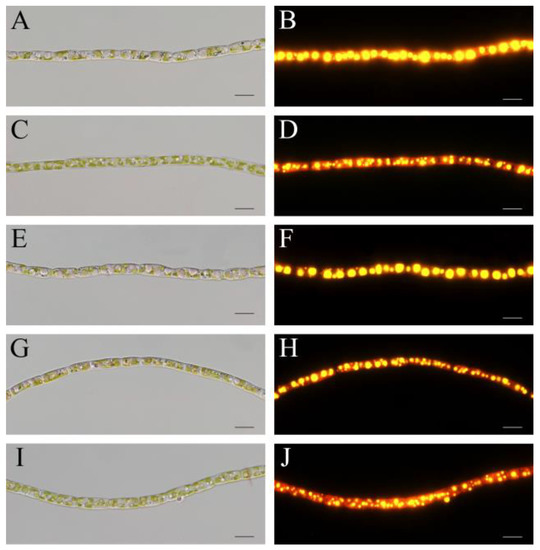 Morphological observations of T. aequale under bright field (left) and fluorescence microscopes (right). T. aequale was cultured in BG11 (A,B), BG11 + P (C,D), BG11 + Mg (E,F), BG11 + P + Mg (G,H), and M-zarrouk (I,J) and samples were taken on day 12 for microscopy. Cellular lipid bodies were stained with the fluorescent dye Nile Red. Scale bars, 10 μm.