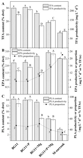 The cellular content of PLA, proportion of PLA in TFA, and productivity of PLA followed essentially the same trends as that of TFA. A high PLA content of 48% in TFA and the highest PLA productivity of 94.7 mg L−1 d−1 were achieved in both BG11 and BG11 + P cultures (Figure 3C).