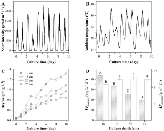 Solar intensity (A), ambient temperature (B), biomass concentration (C), and volumetric (filled column) and areal (blank column) biomass productivities of T. aequale (D) maintained in 0.56 m2 S-ORP outdoors at the culture depths of 10, 15, 20, and 25 cm. Different capital letters and lowercase letters indicate significant differences among volumetric and areal biomass productivities, respectively. The experiment was carried out from 18–27 July 2019.